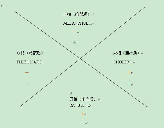 對於人的氣質類型的劃分方法有很多,但以古希臘醫生、樸素唯物主義者希波克拉底的分類和俄國生理學家巴甫洛夫的分類最有影響力。希波克拉底認為人體內含有四種體液:血液、粘液、黃膽汁、黑膽汁,有機體的狀態決定於這四種體液的搭配。黃膽汁相對於膽汁質,血液相對於多血質,黏液相對於黏液質,黑膽汁相對於抑鬱質。氣質形成按體液特性可以劃分為:多血質、粘液質、膽汁質、抑鬱質四種類型。